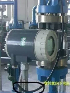 流量計(jì)進(jìn)線口,線纜及穿線管應(yīng)有向下的彎曲,并在*低處開口,以免進(jìn)水,造成短路。
