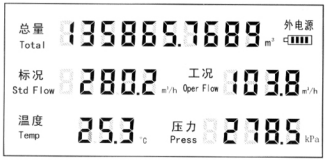 2、總量(規(guī)范體積)*小保存小數(shù)后2位,*大值為99999m3/h,當(dāng)超出時(shí),示值呈現(xiàn)閃爍, 此時(shí)實(shí)踐值為示值的10倍。