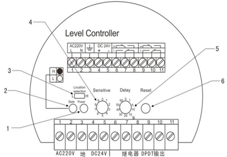 儀表接線見圖所示,儀表接線端的1、2為AC220V,3為大地,4、5為DC24V。6、7、8、9、10、11為兩組繼電器輸出。