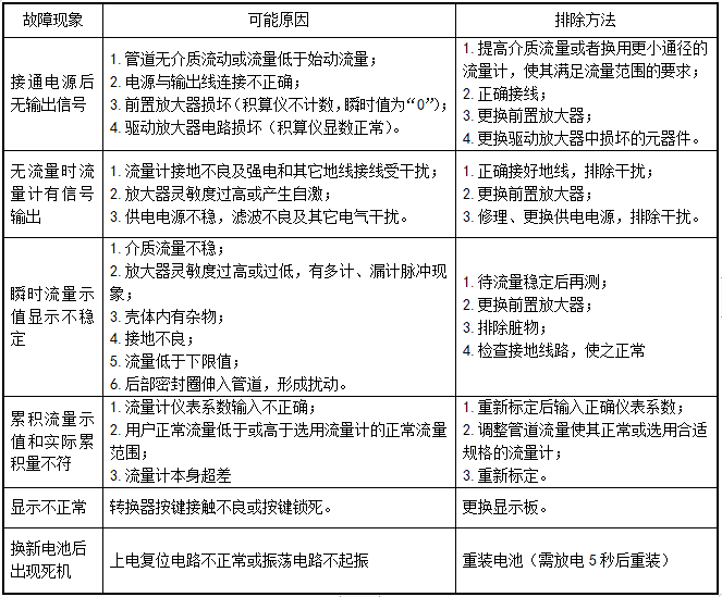 七、旋進旋渦流量計常見故障現(xiàn)象及排除方法