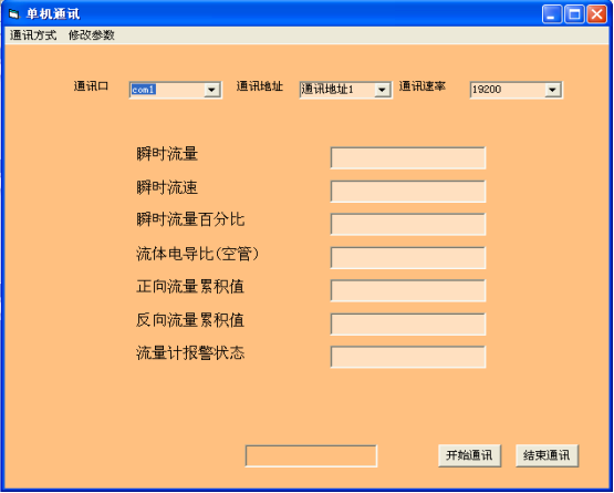 4、在軟件上設(shè)置通訊口(有的計(jì)算機(jī)有兩個(gè)串口,只要一個(gè)串口時(shí)設(shè)置為com1)、通訊地址和通訊速率使他與您在電磁流量計(jì)設(shè)置的相同,點(diǎn)擊開(kāi)端。